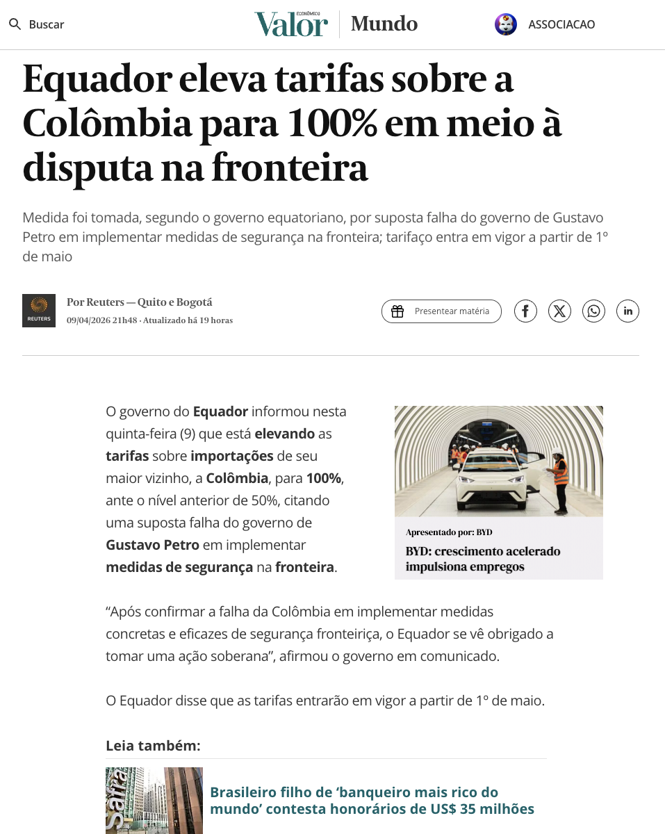 ブラジルの消費者物価指数(IPCA)は3月に前月比0.88%上昇し、2月の0.70%から加速した。3月としては2022年以来の高水準で、市場予想の中央値0.76%も上回った。32機関の予測レンジ(0.47〜0.82%)の上限を超えた形だ。運輸が1.64%上昇して0.34%ポイント、食品・飲料が1.56%で0.33%ポイント押し上げ、両部門で全体の76%を占めた。年初来は1.92%、12カ月では4.14%と伸びが強まっている。(1)